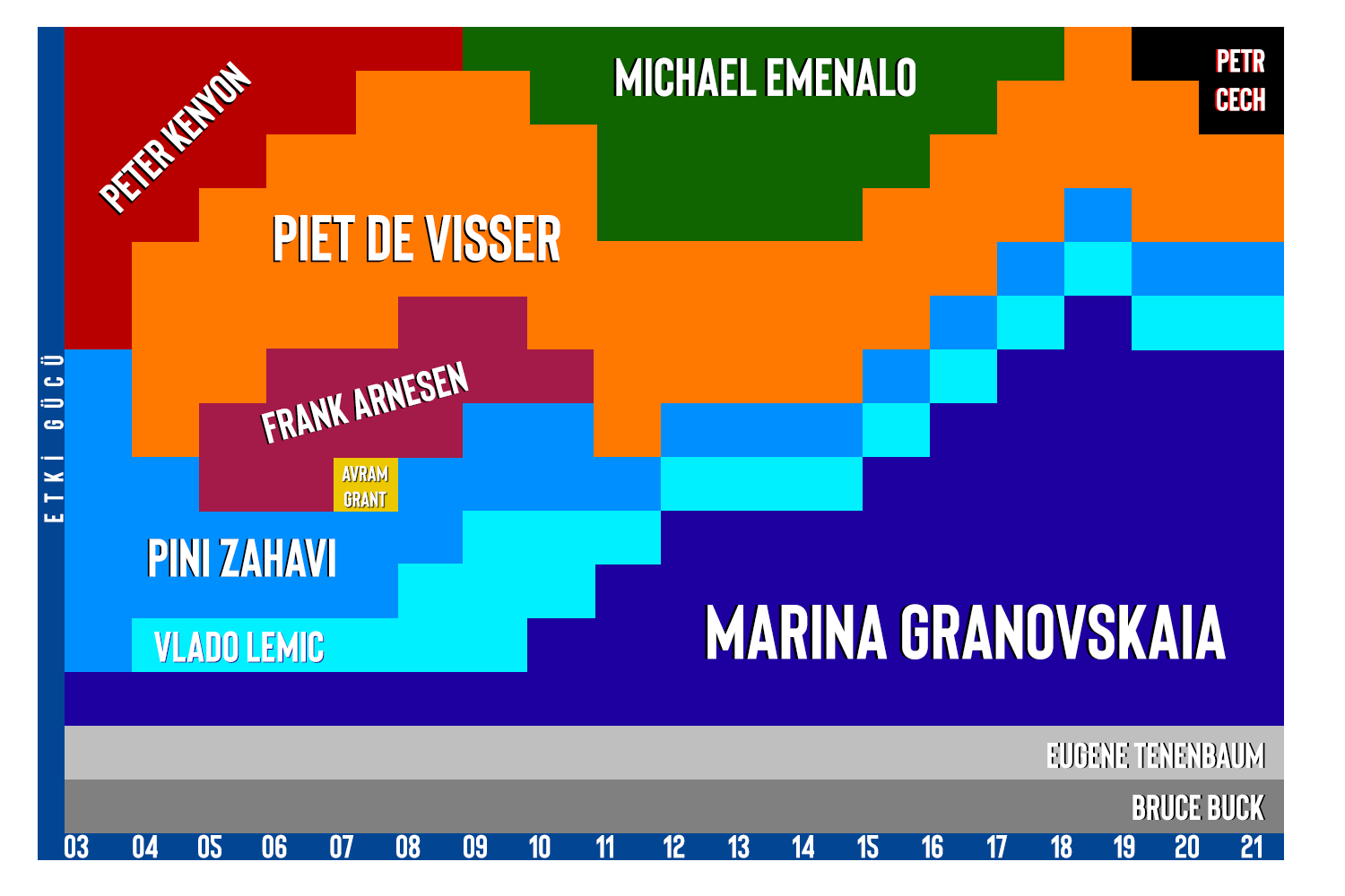 Fakat ilk beş yıllık bu şaşaalı dönemi, Chelsea’nin daha sürdürülebilir bir yapılanma arayışına girdiği ikinci dönem izleyecek; Roman Abramoviç’in kulübün işleyişine dair fikir aldığı ve başkan üzerinde farklı etki güçlerine sahip olan bir danışman ekibi ortaya çıkacaktı. Yaptığım çizimle bu danışman ekibinin Abramoviç üzerinde kurduğu etkiyi kabaca anlatmak ve yıllara bağlı değişimi göstermek istemiştim.